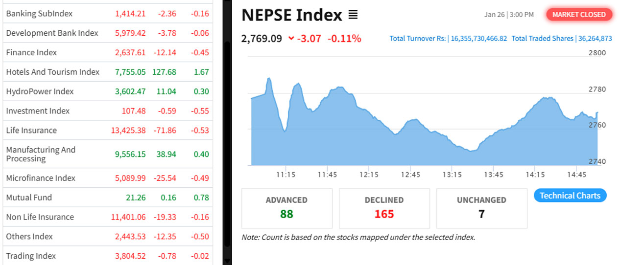 काठमाडौँ। साताको दोस्रो कारोबार दिन आज (सोमबार) नेप्से एकल अंकले घटेको छ। अघिल्लो कारोबार दिन आइतबार ५७.५५ अंकले बढेको सेयर बजार निरन्तर उकालो लाग्ने लक्षण देखिएकामा लगानीकर्ताहरू पनि उत्साही बनेका थिए। आजको दिनमा झिनो अंकले नेप्से घटे पनि कारोबार रकम भने बढेको छ। आइतबार ५७.५५ अंकले बढेको नेप्से सोमबार भने ३.०७ अंकले घटेको छ। आइतबारको […]