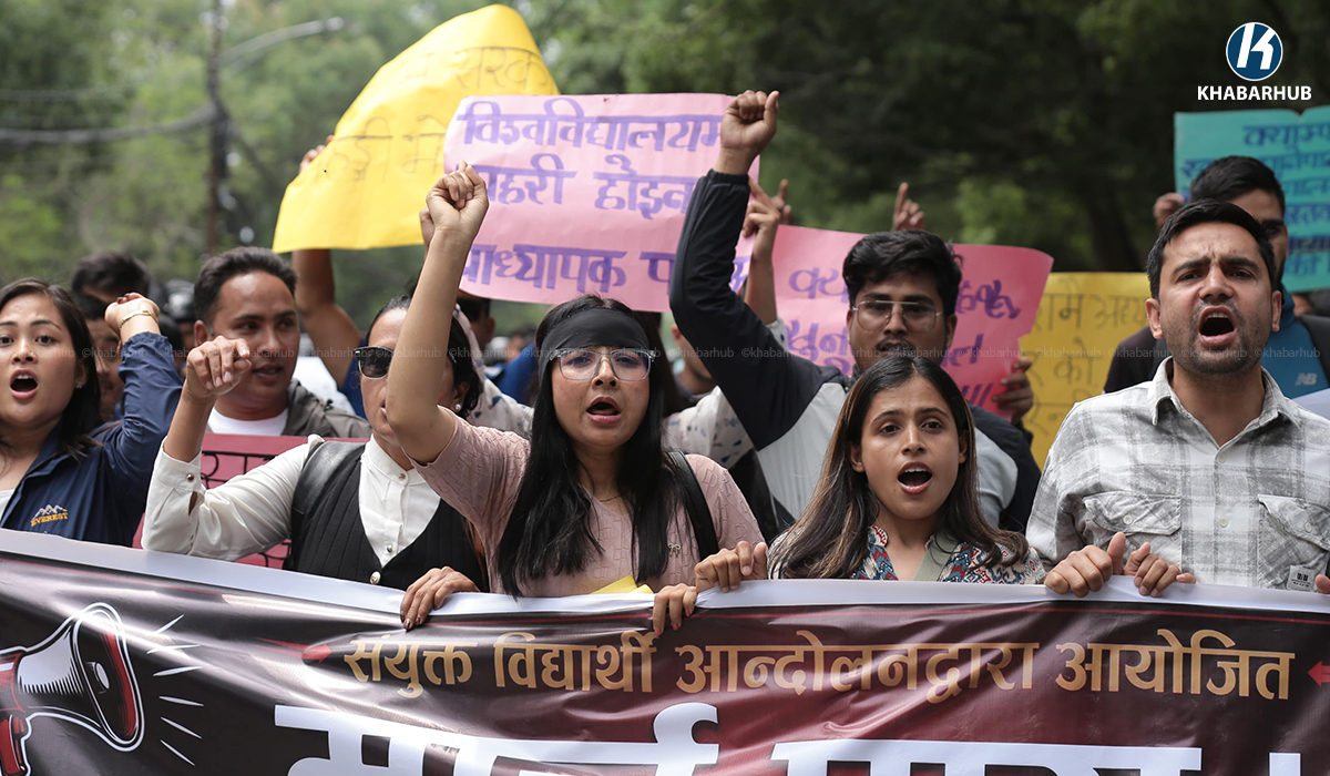 Kathmandu. The United Student Movement has marched on the Tribhuvan University campus protesting the government's preparation to ban student organizations affiliated with various political parties.They have demanded that the government's decision to ban student organizations be immediately withdrawn, stating that it is against the constitution, democratic values and is a direct attack on civil rights.During the protest, they also carried placards with slogans such as 'Control the rising inflation', 'Stop the commercialization of educational institutions', 'Implement meritocracy', and 'Maintain 45% fare discount'....
