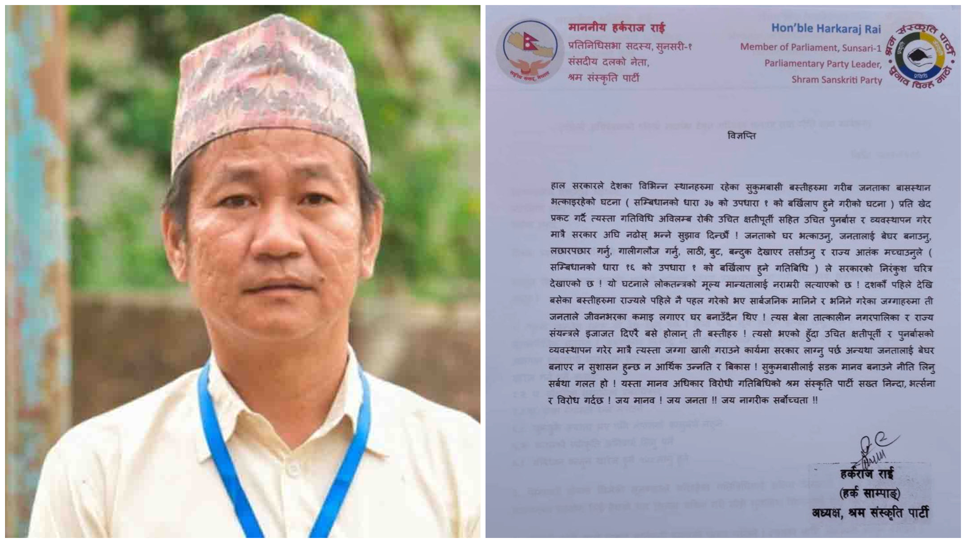 काठमाडौं– श्रम संस्कृति पार्टीका अध्यक्ष हर्क साम्पाङले सरकारले देशका विभिन्न स्थानमा सुकुमवासी बस्ती हटाउने कार्य गरिरहेको भन्दै आपत्ति जनाएका छन्। उनले जारी गरेको विज्ञप्तिमा यस्तो कार्य नेपालको संविधानको धारा ३७ को उपधारा (१) विपरीत भएको उल्लेख गर्दै खेद प्रकट गरेका छन्। अध्यक्ष साम्पाङले बासस्थान भत्काउने कार्य तत्काल रोक्न र प्रभावितलाई उचित क्षतिपूर्ति तथा पुनर्बासको व्यवस्था […]