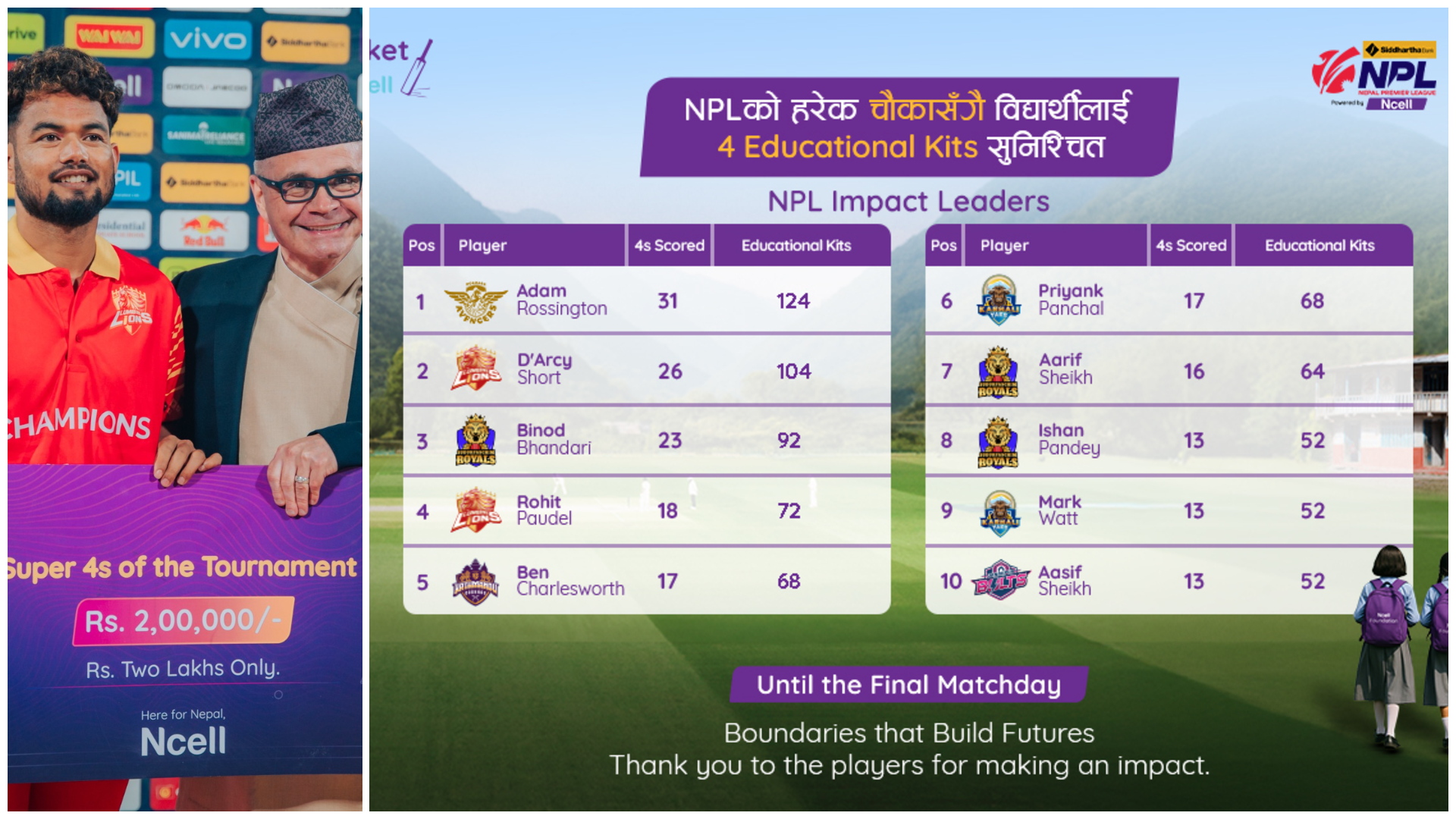 प्रत्येक चौकामा चार वटा शैक्षिक सामग्री वितरण गर्ने सामाजिक पहललाई निरन्तरता दिँदै एनसेलले एनपएिल दोस्रो संस्करणमा पनि हरेक चौकाको प्रहारमा चार वटा शैक्षिक सामग्री प्रदान गर्ने प्रतिबद्धता जनाएको थियो।